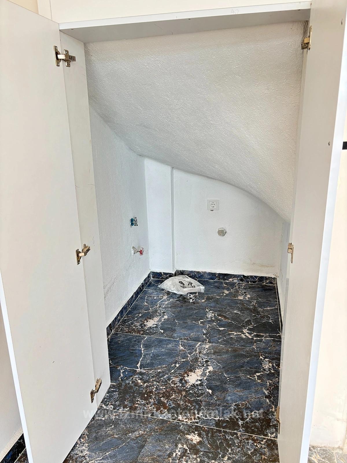 - Die Küche ist L-förmig. Die Küchenschränke sind aus MDF.